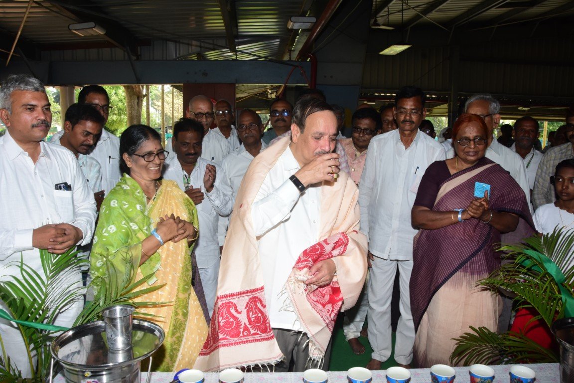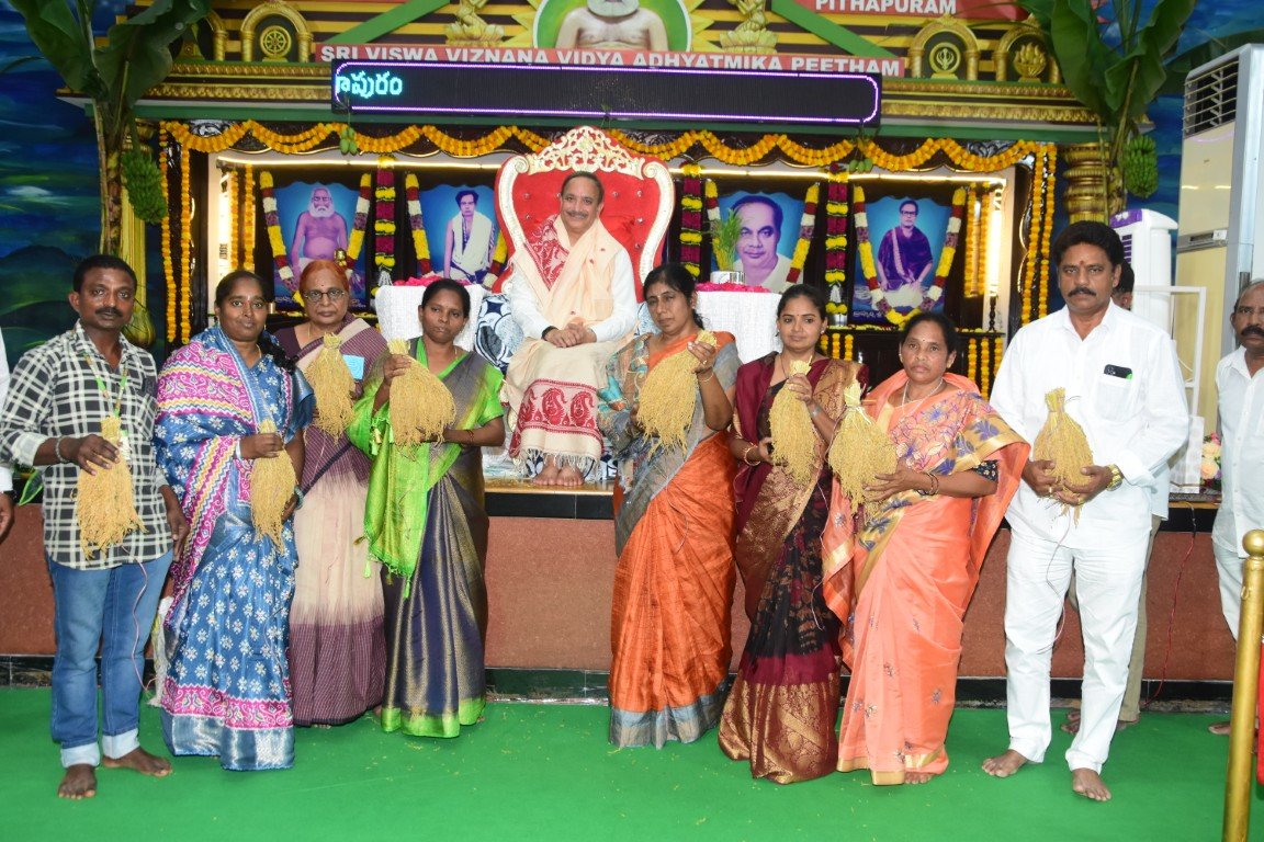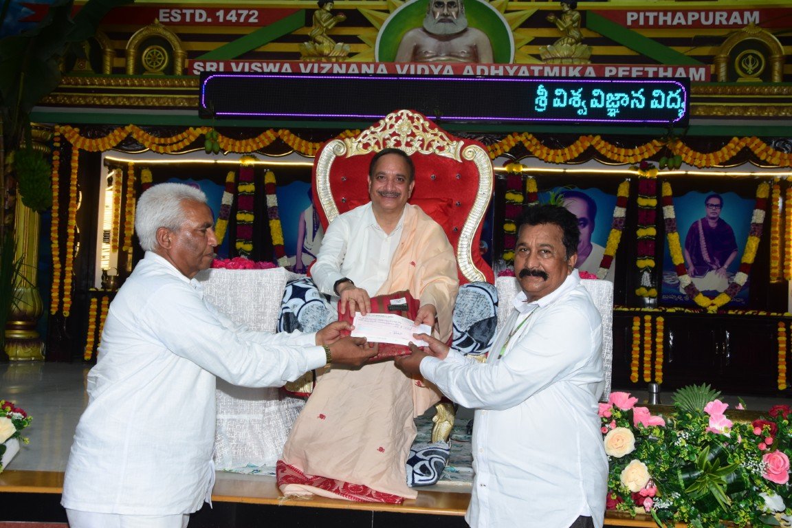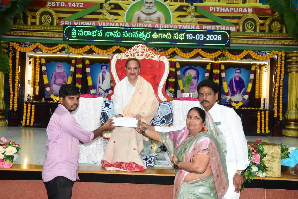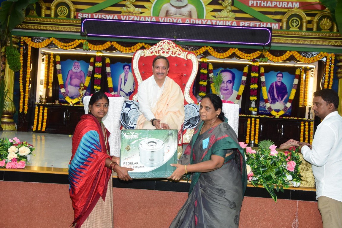 At the Sri Parabhava Nama Samvatsara Ugadi meeting held at the Pithapuram main Ashram premises, the Peethadhipathi, Dr. Umar Alisha Sadguruvarulu, inaugurated a buttermilk distribution center (Chalivendram) established by the Umar Alisha Rural Development Trust. Additionally, through the Trust, Dr. Umar Alisha Sadguruvarulu presented a scholarship of 70,000 rupees to a student, a check for 32,500 rupees for 50 chairs for the Rajamahendravaram Ashram, a sewing machine to a poor woman, an idli-making vessel for women’s economic empowerment, and grain bunches as food for birds.