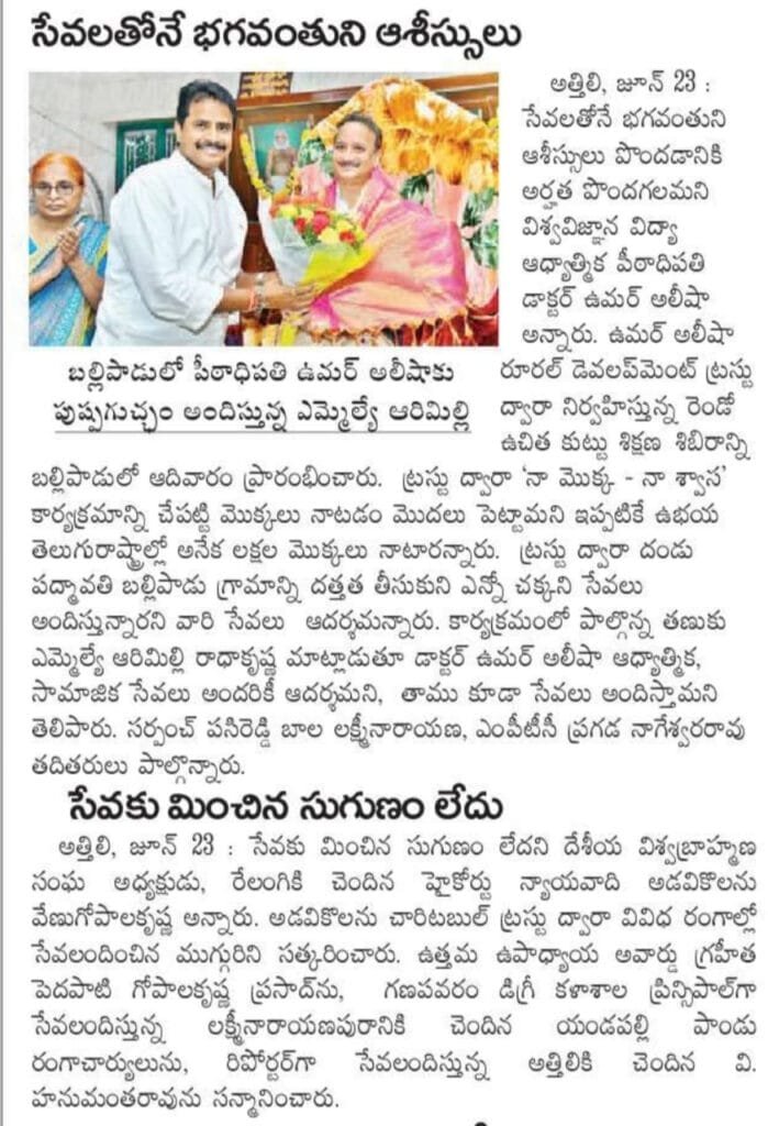 సేవ ద్వారా భగవంతుని ఆశీస్సులు పొందటానికి అర్హతను పొందగలమని శ్రీ విశ్వ విజ్ఞాన విద్య ఆధ్యాత్మిక పీఠ పీఠాధిపతులు డా. ఉమర్ ఆలీషా సద్గురువర్యులు తెలిపారు. ట్రస్ట్ ద్వారా నిర్వహిస్తున్న రెండవ ఉచిత కుట్టు శిక్షణా శిబిరాన్ని ఆదివారం ప్రారంభించిన డా.ఉమర్ ఆలీషా స్వామి మాట్లాడుతూ మనము భూమిపైకి వచ్చినప్పుడు ఏమీ తీసుకురాలేదు, అలాగే పోయేటప్పుడు కూడా ఏమీ తీసుకువెళ్లలేము. సేవ చేయాలి అనుకున్నప్పుడు అనేక అవాంతరాలు, అవరోధాలు ఏర్పడవచ్చు. అయినప్పటికీ వెనుకంజ వేయకుండా సాధించాలనే సత్సంకల్పంతో ప్రయాణించినట్లయితే చక్కటి ఫలితం పొందవచ్చని ప్రేరణను అందించారు.